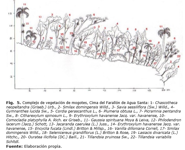 Complejo de vegetación de mogotes (CVM): se realizaron dos perfiles en la pared vertical y dos en la cima de los farallones de Agua Santa; uno en Piedra China; uno al este de Piedra China, dos al este de La Casimba de Llanadas, uno encima de la cueva de La Chucha y uno en el pequeño mogote de La Mina.