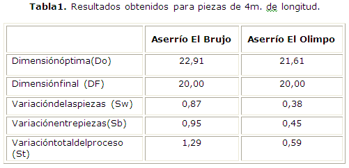 De acuerdo con los valores de grosor promedio de las piezas muestreadas (Tabla1), en ningún surtido se corta la madera verde con tolerancias de volumen suficientes para satisfacer las dimensiones finales reglamentadas para el mercado en relación con la dimensión óptima.