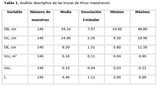 En la Tabla 1, se aprecian los resultados estadísticos que describen la muestra utilizada para la elaboración del modelo matemático y para posteriormente elaborar la tabla de volumen para las trozas. Como se aprecia, los diámetros oscilan de 4.8 cm. en la sección menor de las trozas hasta 48.80 cm. en la base de las mismas. La longitud fluctúa en un rango de 3 a 6 m.
