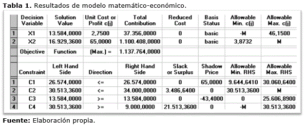 Se muestran los resultados del modelo económico- matemático a través del programa WinQSB, lo que permitió la proyección del potencial de carbón vegetal para lograr, a partir del volumen óptimo de producción destinado para los dos mercados, una ganancia máxima aproximada de 1 138 mil pesos si se producen 13 584 sacos de carbón para el mercado nacional y 16 929 sacos para mercado internacional teniendo en uso toda la cantidad de leña disponible. (Tabla 1)