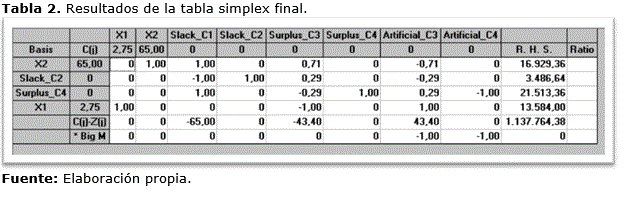 La tabla simplex final muestra el efecto que causan los cambios en las alternativas establecidas en la solución óptima básica obtenida y en la ganancia, los cuales pueden ser favorables según las necesidades de la empresa. Se demuestra que por cada m3 de la leña que se aumente se obtendrán 65 pesos de ganancia; para ello se debe producir 1 saco de carbón destinado al mercado internacional, y eliminar 1 saco destinado al mercado nacional. Al considerar que la disminución de la demanda nacional es favorable para la solución general, los resultados indican que por cada saco de carbón vegetal menos en el mercado nacional se puede producir 0,71 sacos de carbón para el mercado internacional y obtener una ganancia de 43,4 pesos. (Tabla 2).