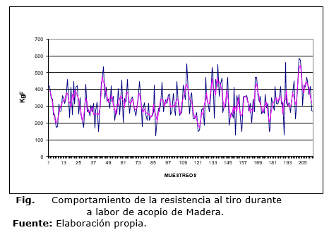 Si analizamos estos elementos para nuestro caso de estudio podemos inferir que las variaciones de la resistencia durante el acopio de madera son muy variables y dependen de factores como: la pendiente, condiciones del suelo y peso de la madera (Ver figura). La variación de la resistencia produce estrés en los animales y es otro elemento que incide negativamente en el rendimiento del conjunto, según consideró Jróbostov (1977), Ortiz (1992).