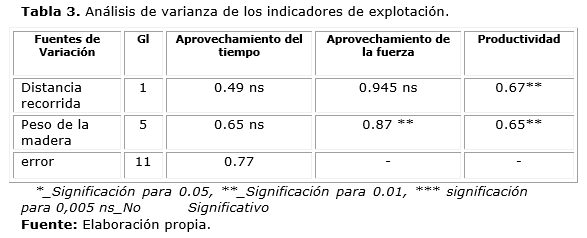 El resultado del análisis de varianza expresa que existe diferencia, al relacionar la productividad, con la distancia recorrida y el peso de la madera; lo que significa que el comportamiento del conjunto, desde el punto de vista de explotación, no tiene dependencia absoluta de las características del proceso de acopio, aunque si en el aprovechamiento de la fuerza que se ve determinado por el peso de la madera.