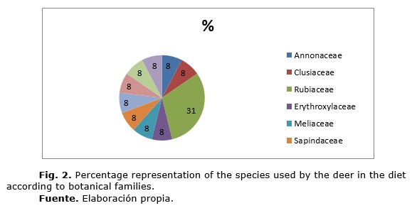 Las especies de plantas incluidas en la dieta correspondieron a 10 familias botánicas, en las que se destacaron por el número de especies que la integran, la familia Rubiaceae.