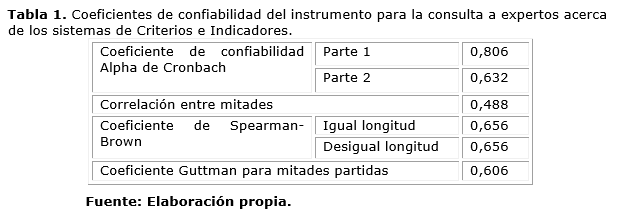 Se puso a consideración de los expertos la propuesta de criterios e indicadores y se validaron estadísticamente mediante la evaluación de la fiabilidad del instrumento aplicado en el Método Delphi, a través de la determinación de los coeficientes: Correlación entre mitades, Guttman, Spearman Brown (igual longitud), Spearman Brown (desigual longitud) y el Coeficiente de Confiabilidad Alpha Cronbach.