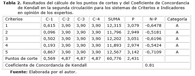 Los puntos de cortes determinados demuestran que las cualidades de los sistemas de Criterios e Indicadores creados se califican como altamente relevantes en la segunda circulación y el Coeficiente de Concordancia es de 0.81, según se observa en la tabla2, lo que permite inferir que existe una adecuada coincidencia de criterios entre los expertos.