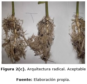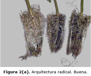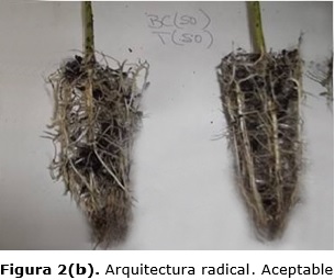 La arquitectura radical fue buena para la mayoría de los sustratos (figuras 2b y 3), excepto T que se consideró malo. También se encontró dependencia del sustrato con la arquitectura radical (p <0,05) para un coeficiente de contingencia de 0,796, indicando que la presencia de BC favorece el sistema radical.