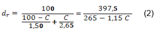 Dónde: M representa la masa del sustrato (g); V el volumen del cilindro (cm3). La densidad real se calculó a partir del contenido de cenizas (C), referido a materia seca de la muestra, considerando el sustrato como una mezcla de dos componentes, uno orgánico (su materia orgánica) y otro mineral (cenizas), cuyas densidades reales son 2,65 y 1,50 g mL-1 respectivamente por la expresión: