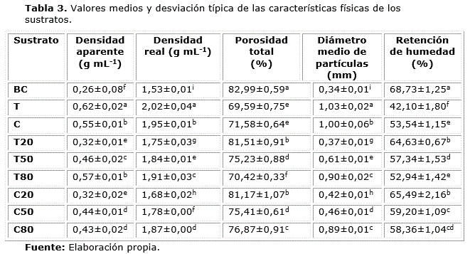 En la tabla 2 se presentan los resultados de las propiedades físicas de los sustratos, donde se encontró que los valores más bajos de densidad aparente y real corresponden al BC, mientras que los mayores los presentaron C y T. Las mezclas presentaron valores intermedios al de los constituyentes individuales, lo que evidenció que las proporciones empleadas influyen significativamente en estas propiedades, evidenciándose que un aumento en la proporción de BC disminuye la densidad.