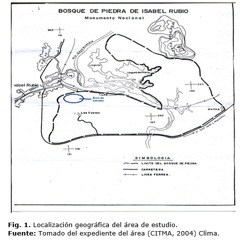 El estudio se realizó en cuatro hectáreas del Bosque de Piedra, que se encuentran cercanas al asentamiento urbano del consejo popular de Isabel Rubio. Este ecosistema tiene categoría de Monumento Nacional y ocupa un área de 136,6 ha, y se localiza en el lote 122 del rodal I, unidad silvícola Guane de la empresa Forestal Integral Macurije, registrado en los datos históricos de esta entidad como Santo Cristo del Valle.
