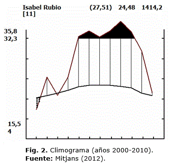 Se muestra el climograma, que representa los principales parámetros climáticos del área, revelando similitud con las características medias del clima cubano, con dos temporadas marcadas. Los datos de las precipitaciones y temperaturas que se utilizaron, comprendidos en los años del 2000 al 2010, están disponibles en la estación meteorológica de Isabel Rubio, municipio Guane (Mitjans, 2012). (Figura 2)