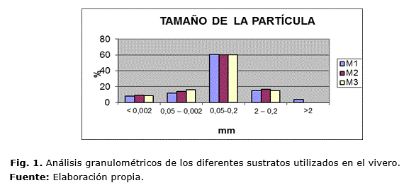 Analizando el tamaño de las partículas, figura 1, en todos los sustratos, la fracción predominante dentro de la mezcla es la que tiene el mayor diámetro (0,05-0,2mm), presentando igual distribución.