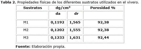 Analizando la caracterización física de estos sustratos (tabla 3), Ansorena (1994), plantea que los valores de la densidad aparente deben encontrarse por debajo de 0,40, y la densidad real entre 1,45 y 2,65. Montoya y Cámara (1996), dan valores a la porosidad de 6080%. El menor valor de densidad aparente se obtiene en el sustrato M1 y los mayores valores se obtienen en el sustrato M3. Los valores de densidad aparente permiten conocer la cantidad de sustrato contenido en un volumen determinado así como estimar el grado de descomposición de la materia orgánica en los mismos. En cuanto a la densidad real en todos los casos se encuentran en el rango óptimo definido por el citado autor.
