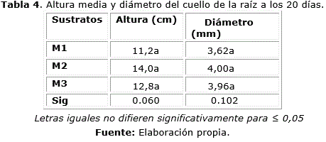 En la tabla 4 se observa la altura alcanzada por la planta a los 20 días después de la siembra. La altura es un indicador del grado de desarrollo de la parte aérea, que determina los procesos fotosintéticos y de transpiración de la planta, Thompson, (1985) y Pineda-Ojeda et al, (2004), plantean que plantas grandes mejoran la constitución morfológica y mayor supervivencia y crecimiento en campo, pero que implica mayor tiempo y espacio dentro del vivero donde se busca producir la mayor cantidad de plantas en el menor tiempo y más bajo costo posible; ello va en detrimento de la calidad de las plantas producidas, quien además añade que la altura no es un buen predictor de la supervivencia. Con respecto al diámetro en el cuello de la raíz, los mayores valores se obtuvieron en el sustrato M3 (4,01 mm) y el menor (3,3mm) coincide con el sustrato compuesto por desecho orgánico coincidiendo con la menor altura. La norma general es la utilización de plantas con altura comprendida entre 15 y 25 cm y un calibre (diámetro en cuello de la raíz) mínimo de 2 mm.