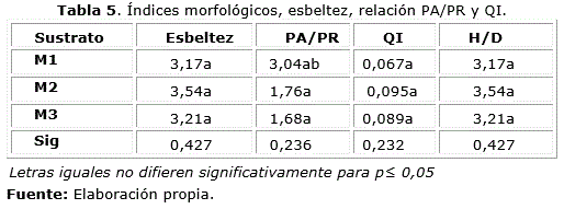 Se observa el índice de esbeltez, relación parte aérea, parte radical, relación altura diámetro y el índice de Dickson (QI). (Tabla 5)