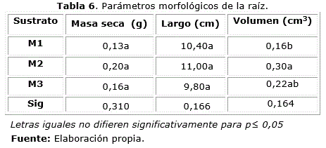 Se observan algunos parámetros morfológicos relacionados con el sistema radical de la planta. Como se puede apreciar la mayor longitud de la raíz se obtienen con los sustratos M2 (11cm). El menor valor de longitud de la raíz se obtiene en el sustrato M3 (9,80 cm). (Tabla 6)