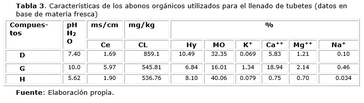 En la tabla 3 aparecen las características de los abonos orgánicos utilizados para el llenado de tubetes (datos en base fresca), cuyos valores de pH en KCl van desde 5,62 (ligeramente ácido) en el humus de lombriz, hasta 10 en la gallinaza, el desecho orgánico presenta un pH de 7,40, según clasificación de Cairo y Fundora (2007). La disponibilidad máxima de nutrientes ocurre a un pH de 5,0 a 5,5 encontrándose solamente el humus de lombriz cercano al óptimo. Las especies forestales toleran un intervalo relativamente amplio de valores de pH, pero las confieras crecen mejor en un pH alrededor de 5,5 y las latifolias prefieren valores relativamente mayores, alrededor de 6,55 (Landis et. - al., 2000). El porcentaje de materia orgánica en los materiales utilizados está en el rango de 16 a 40%, los valores más altos lo alcanzan el humus de lombriz con 40, 06%. La materia orgánica mejora la estructura, los espacios porosos y disminuye la densidad, lo que trae consigo una mejor permeabilidad del sustrato. En el caso de la conductividad eléctrica se encuentra evaluado como no salino el humus de lombriz y el desecho orgánico, en el caso de la gallinaza resultó moderadamente salino. Referente a los cloruros solo en el humus de lombriz sus concentraciones son adecuadas para el desarrollo de las especies forestales.