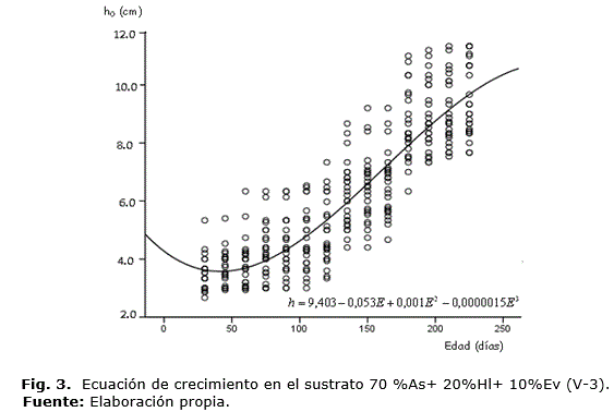 Ballate (2006) con la especie Swietenia mahagoni (L) Jacq., empleando sustratos compuestos por estiércol vacuno y estiércol equino, demostró mejorar la calidad de las plantas producidas en contendores y la ecuación que mejor ajuste presentó para la altura es la de crecimiento.