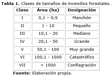- Tamaño de los incendios (clase de tamaño): la clasificación de incendios por clase de tamaño es un dato muy importante para la evaluación de la efectividad de los servicios de combate de incendios forestales. Mayor efectividad implica mayor concentración de incendios en la clase de menor área (Ramos, 1999). Se utilizó la clasificación propuesta por Oharriz (1991). (Tabla 1).