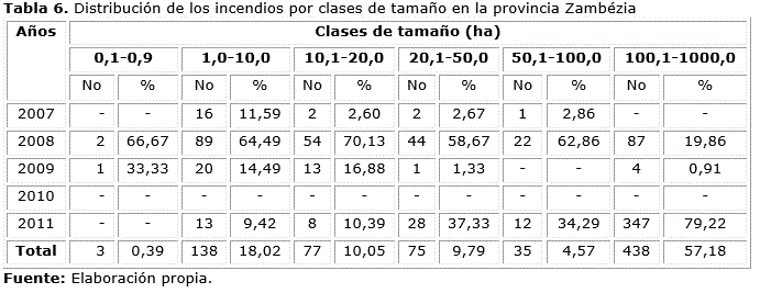 La distribución de los incendios en la vegetación según las clases de tamaño se presenta en la Tabla 6. La mayor cantidad de incendios se ubica en la clase VI (incendios catastróficos) con el 57,18 % del total. Estos resultados no coinciden con los obtenidos por García (2007) para la provincia Pinar del Río, Cuba, de 1997 al 2006; Castro (2009) para la Empresa Forestal Integral (EFI) «Macurije», Pinar del Río, de 1999 al 2008; y Padrón (2012) para la EFI «Minas de Matahambre», Pinar del Río, de 2002 al 2011, quienes reportan la mayor cantidad de ocurrencias ubicadas en las clases I y II, lo cual es indicador de un eficiente sistema de protección. Rodríguez y Soares (2004) obtuvieron para el periodo 19982001 que, en Monte Alegre, Brasil, el 96,56 % de los incendios quedó en las clases I y II y en Pinar del Río, Cuba, se ubicó en estas clases el 70,06 % de los incendios.