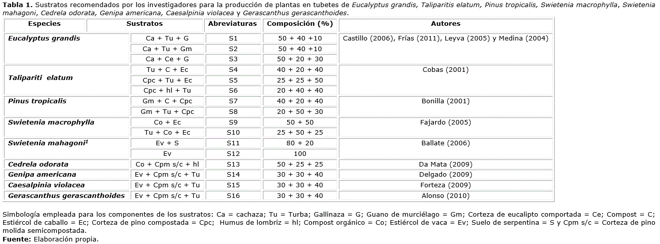 Se presentan los mejores sustratos estudiados para cada una de las especies. (Tabla 1.)