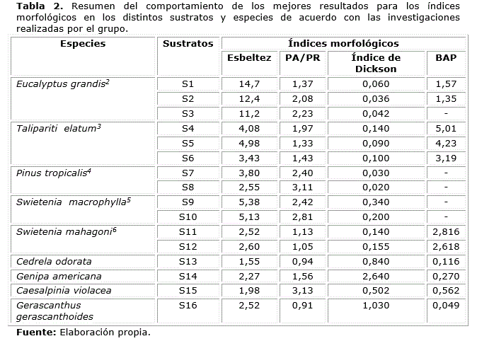 En las investigaciones realizadas se han hecho estudios tanto de las características de los sustratos empleados para cada especie, como de los parámetros de la calidad de planta: en los atributos morfológicos, la altura, el diámetro en el cuello de la raíz, el peso de las plantas, tanto de la parte aérea (tallo y área foliar) como la radical. Para los índices morfológicos se estudió la relación parte aérea/parte radical (PA/PR), la esbeltez, que es la relación entre la altura y el diámetro de la plantica (h/d), así como el índice de Dickson (QI) y por último el Balance hídrico en la planta (BAP).
