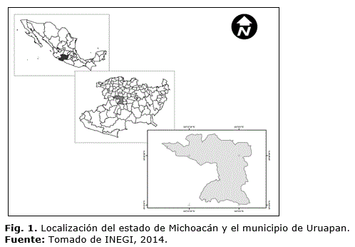El municipio de Uruapan está ubicado en la porción occidental del estado de Michoacán (Figura 1), entre los paralelos 19° 17' y 19° 45' latitud norte, y los meridianos 101° 50' y 102° 14' longitud oeste. Limita al norte con los municipios de Los Reyes, Charapan, Parachoy Nahuatzen; al este con Tingambato, Ziracuaretiro y Taretan; al sur con Gabriel Zamora, Parácuaro, y al oeste con Nuevo San Juan Parangaricutiro, Tancítaro y Peribán (Boccoet. al., 2001). Su distancia a la capital del Estado es de 120 km. Su superficie es de 954.17 km², lo que representa 1.62 % del total estatal.