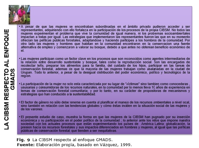 A continuación en la figura 9, se muestra un análisis de la CIBSM con respecto al acceso, uso y conservación de los recursos forestales, referidos a los postulados o principios básicos del GMADS, los cuales fueron pieza clave en el análisis del presente estudio; en donde se plasma de manera general las relaciones de género, la conservación, y la participación de las mujeres y hombres, en torno a las estrategias de conservación que se implementaron en la comunidad frente a la problemática ambiental.