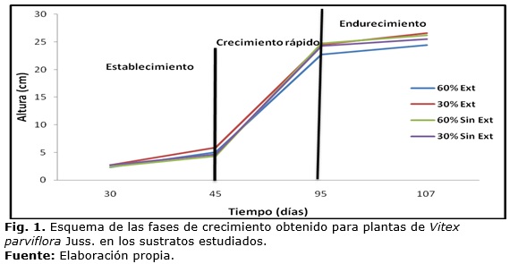 En la Figura 1 se observa la dinámica de crecimiento en altura, para plantas de Vitex parviflora Juss. en los diferentes sustratos estudiados. En la misma se observa la presencia de tres fases: