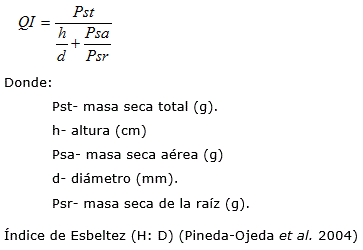 El Índice de Dickson (I.D.) (Dickson et al., 1960, citado por Olivo y Buduba, 2006, Romero et al., 2012 y Alonso, 2013), combina parámetros morfológicos de longitud y masa, y es posible calcularlo por la siguiente fórmula: