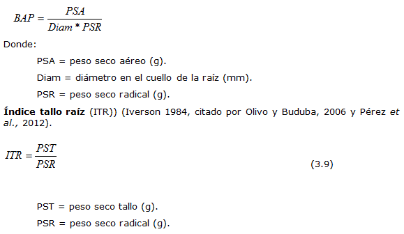Establece la relación existente entre la parte aérea de la planta, la parte radical y el diámetro del cuello de la raíz. De esta forma el BAP se determina mediante la siguiente fórmula: