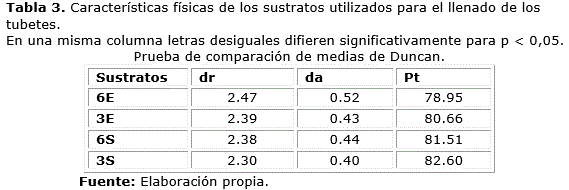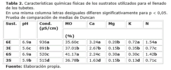 En la Tabla 2 se aprecian las propiedades químicas de los sustratos utilizados para el llenado de los tubetes.