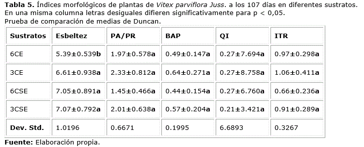 En la Tabla 5 se puede observar que existe una ligera diferencia entre los valores del índice de Dickson (QI), en los diferentes sustratos, pero que los mismos no son significativos estadísticamente para todos los casos.