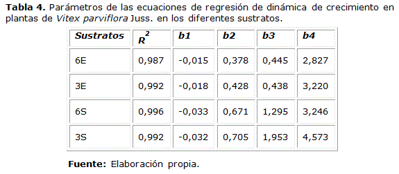 La utilización de modelos matemáticos para la descripción del comportamiento de diferentes parámetros de la planta, durante su desarrollo en el vivero, resulta de utilidad para predecir el tiempo en que esta alcanza el momento óptimo para la plantación (Tabla 4).
