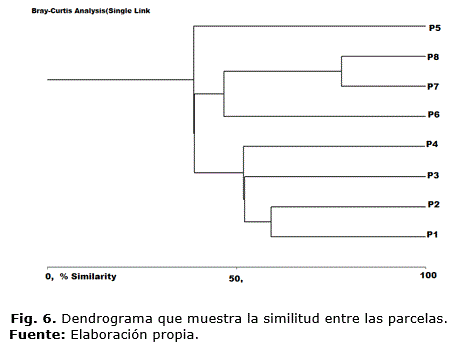 Los resultados de la clasificación de las parcelas (Figura 6) muestran tres grupos (8, 7,6), (4, 3, 2,1).y 5. Es significativo que la parcela 5 difiere de las restantes fundamentalmente por contar con la presencia de Clusia rosea, Erythroxylum havanense , Tectona grandis,, Lonchocarpus domingensis y Sapindus saponaria estas últimas se encuentra con un gran número de individuos, lo que denota que existen condiciones de humedad del suelo en esta parcela, que propician su desarrollo.