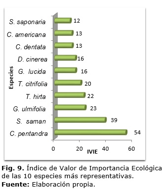 De manera general en la Figura 9, se muestra el IVIE de las 10 especies más representativas del MNBPIR, observándose con los mayores valores: C pentandra, S. saman, G.ulmifolia, T.hirta. En cuanto a C. pentandra, el valor del IVIE está condicionado principalmente por su dominancia; la frecuencia y abundancia presentan valores bajos. No siendo así en la especie Samanea saman la cual se encontró en todos los estratos y clases diamétricas.