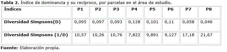 Se representan los valores correspondientes a la biodiversidad, expresados por el índice de Simpson y su recíproco, que muestran la dominancia y diversidad de especies para cada una de las parcelas del muestreo. Los mayores valores de diversidad se encuentran de manera descendente en las parcelas ocho, siete y tres. (Tabla 2)