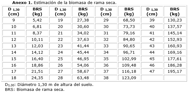 Para la investigación se talaron 138 árboles tipos, seleccionados a partir de la ejecución de un muestreo aleatorio de 40 rodales, los cuales fueron desramados y desfoliados, Y se realizó el pesaje por separado de la biomasa de ramas de cada uno de los árboles, donde se determinó el peso seco a partir del contenido de humedad en muestras representativas de las ramas, tomadas al azar, y secadas en estufas a 105°C hasta llevarlas a peso constante. Procedimientos similares fueron realizados por Schlegel, B; J Gayoso; J Guerra. (2001), Loguercio y Defossé (2001), Montero y Kanninen (2002), Fonseca et al. (2009), Gyeng, J.; M. E. Fernández; M. Sarasola; M. De Urquiza y T. Schlichter (2009) utilizando la fórmula que se muestra a continuación: