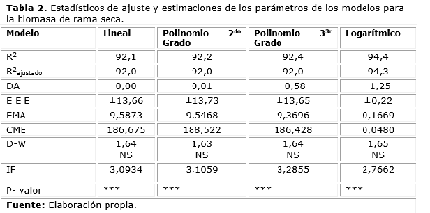 Para estimar la biomasa de rama seca, a partir del diámetro normal (d1,30), se empleó la regresión lineal, donde se utilizaron para el ajuste los modelos de regresión. (Tabla 1)