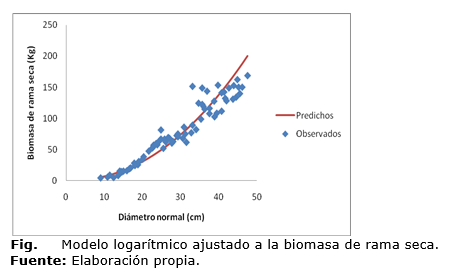 Se muestra el comportamiento del modelo logarítmico ajustado a la biomasa de rama seca. Se destaca de manera general el agrupamiento de los valores observados a diferente diámetro normal.