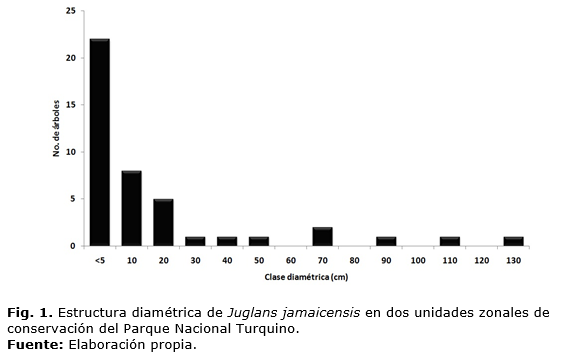La estructura diamétrica de Juglans jamaicensis (Figura 1) fue irregular, indicadora que los individuos plántulas y juveniles se encontraban bajo la sombra de árboles de mayor tamaño y edad, así como que pueden sobrevivir bajo condiciones de menor iluminación como bien refiere Lamprech t (1990) al analizar una estructura diamétrica similar.
