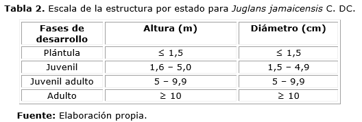 Se caracterizó la estructura horizontal de Juglans jamaicensis mediante un análisis de frecuencias diamétricas con una amplitud de 5 cm. Para caracterizar la estructura por estado de Juglans jamaicensis se utilizó, modificada por el autor, la metodología de Sáenz y Finegan (2000) para estudios de la regeneración natural en bosques tropicales (Tabla 2).
