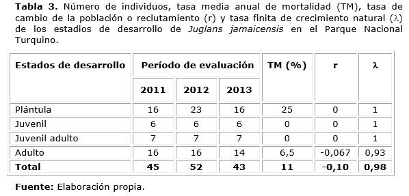 La dinámica de Juglans jamaicensis se evaluó a través del registro de todos los individuos de la especie por tres años consecutivos (2011-2013), y calculados los parámetros tasa media anual de mortalidad, tasa anual de cambios y la tasa finita de crecimiento natural.